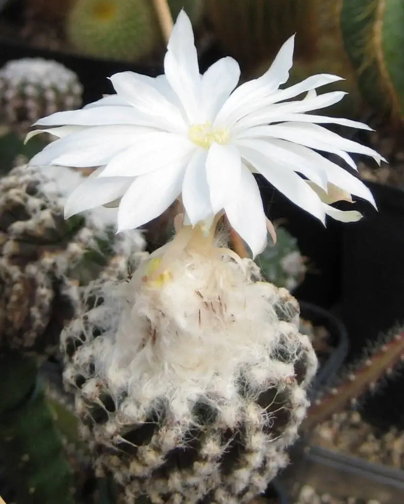 - nächtliche, weiße Blüten die duften schieben sich im Sommer aus einem Cephalium.