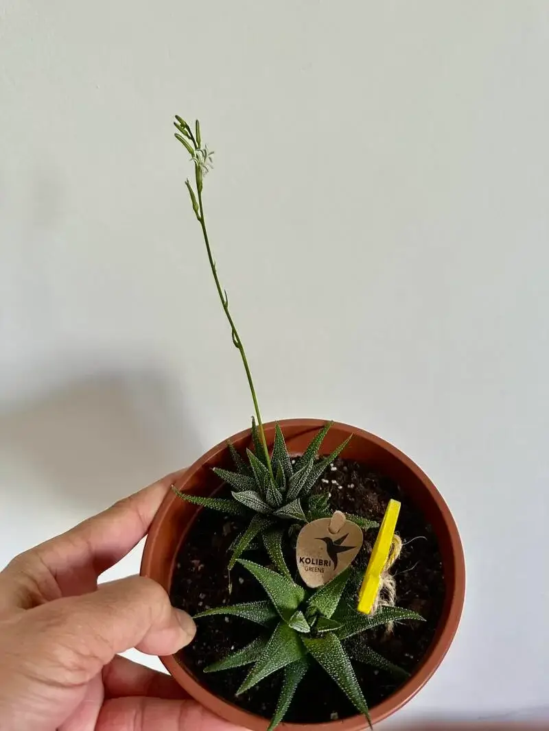 - sehr klein und weiß, am 20 cm langen, überhängenden Blütenstiel sich zeigend.