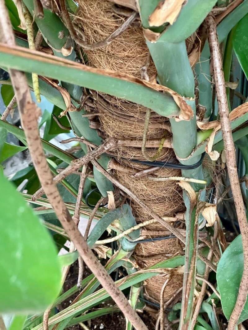 Luftwurzeln in Erde umleiten, keinesfalls wegschneiden. Sie versorgen die Pflanze zusätzlich mit Nährstoffen.